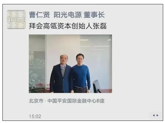 值得一提的是,在陽光電源發(fā)布定增預(yù)案之前的1月26日,陽光電源董事長(zhǎng)曹仁賢的朋友圈里就發(fā)布了一張與張磊的合照,并配文“拜會(huì)高瓴資本創(chuàng)始人高磊”。這不僅引人遐想,高瓴會(huì)像入股隆基一樣,入股陽光電源么??