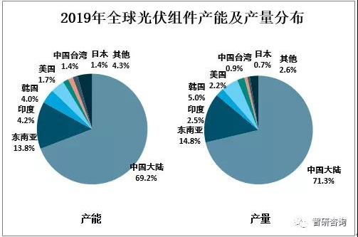 中國為全球最大的光伏組件生產(chǎn)國,從2019年全球各地區(qū)光伏組件產(chǎn)能來看,中國占比69.2%,東南亞占比13.8%,印度占比4.2%;從2019年全球各地區(qū)光伏組件產(chǎn)量來看,中國占比71.3%,東南亞占比14.8%,印度占比2.5%。