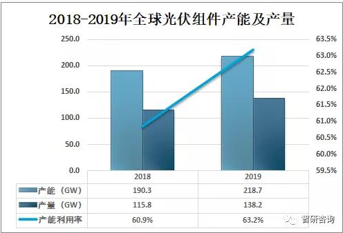截止2019年全球光伏組件產(chǎn)能為218.7GW,較2018年同比增長14.9%;產(chǎn)量為138.2GW,較2018年同比增長19.3%,產(chǎn)能利用率為63.2%。