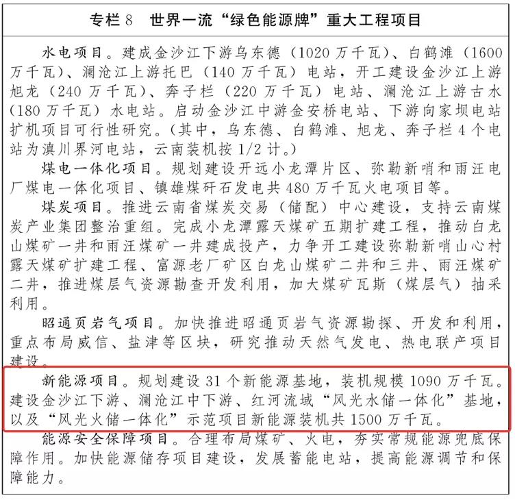 在具體項(xiàng)目方面,“十四五”期間,云南將規(guī)劃建設(shè)31個(gè)新能源基地,裝機(jī)規(guī)模為1090萬千瓦,建設(shè)金沙江下游、瀾滄江中下游、紅河流域“風(fēng)光水儲(chǔ)一體化”基地以及“風(fēng)光火儲(chǔ)一體化”示范項(xiàng)目新能源裝機(jī)共1500萬千瓦。