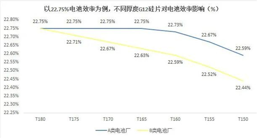 硅片減薄對效率有一定的影響,對此,中環(huán)股份提出測算。以22.75%電池效率為例,不同厚度G12硅片對電池效率影響是,A類電池廠商的生產(chǎn)條件下,應(yīng)用160μm硅片的電池的效率,比175μm的低0.02%。