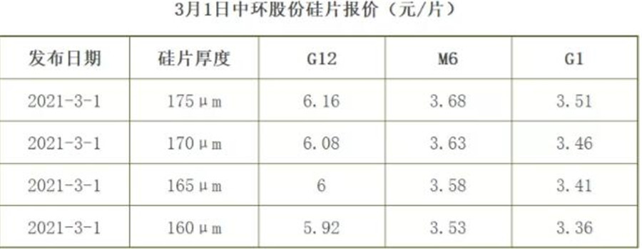 參考中環(huán)股份2月份報價,M6(175μm)售價為3.35元/片,那么3月份M6(160μm)報價漲價0.18元/片,漲幅為5.3%。