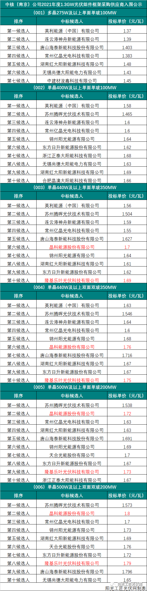 根據(jù)陽(yáng)光工匠光伏網(wǎng)的統(tǒng)計(jì),中核(南京)1.3GW組件集采的開(kāi)標(biāo)結(jié)果如下表所示。