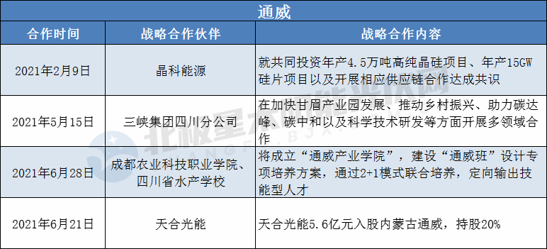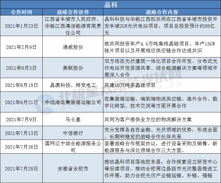 據(jù)北極星太陽能光伏網(wǎng)不完全統(tǒng)計(jì),2021年初至今,已有晶科、通威、晶澳、特變電工、天合光能5家光伏企業(yè)在通過增資入股、合資擴(kuò)產(chǎn)形式成為深度戰(zhàn)略合作伙伴。