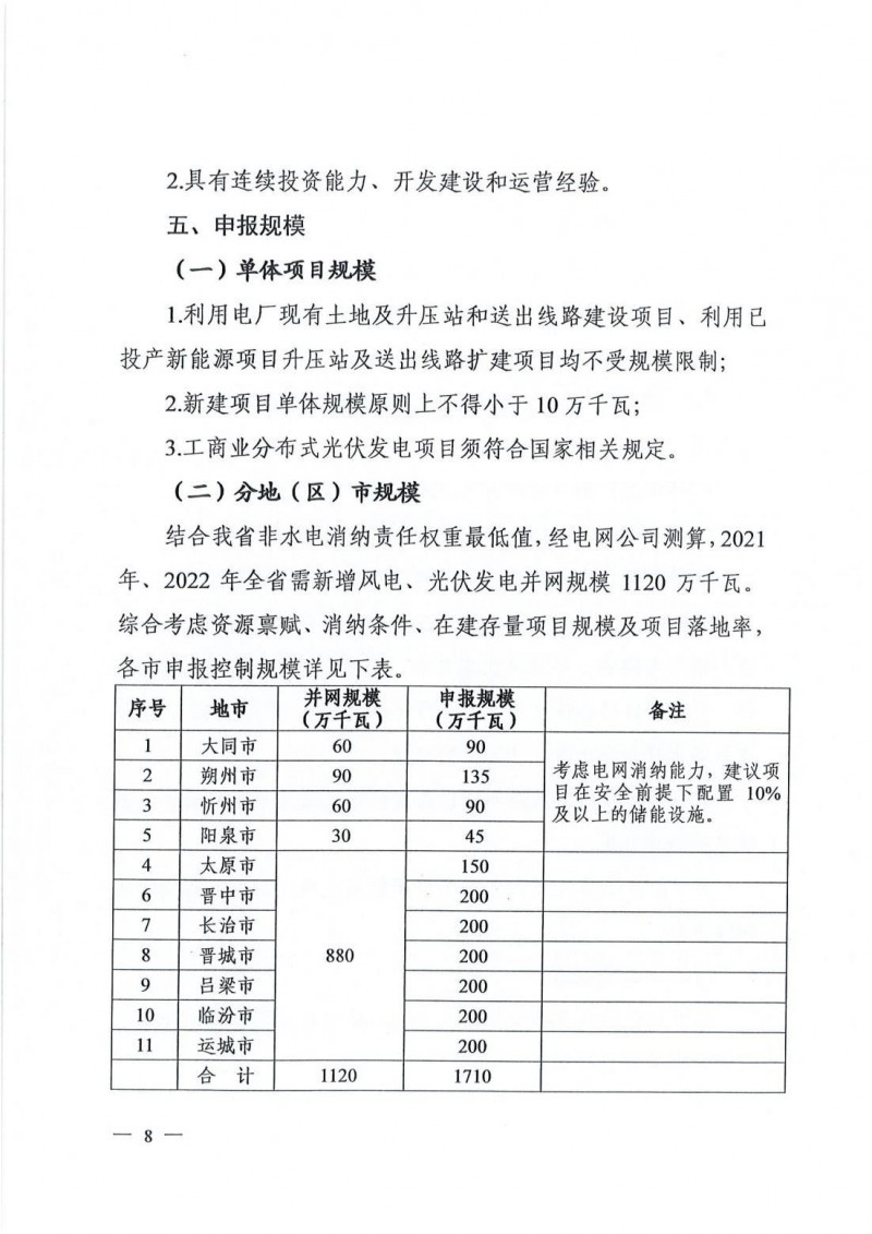 結(jié)合山西省非水電消納責(zé)任權(quán)重最低值,經(jīng)電網(wǎng)公司測算,2021年、2022年山西省需新增風(fēng)電、光伏發(fā)電并網(wǎng)規(guī)模1120萬千瓦。文件明確晉北三市暫不考慮風(fēng)電競配項(xiàng)目,其余地市風(fēng)光發(fā)電項(xiàng)目規(guī)模按2:8比例申報(bào)。