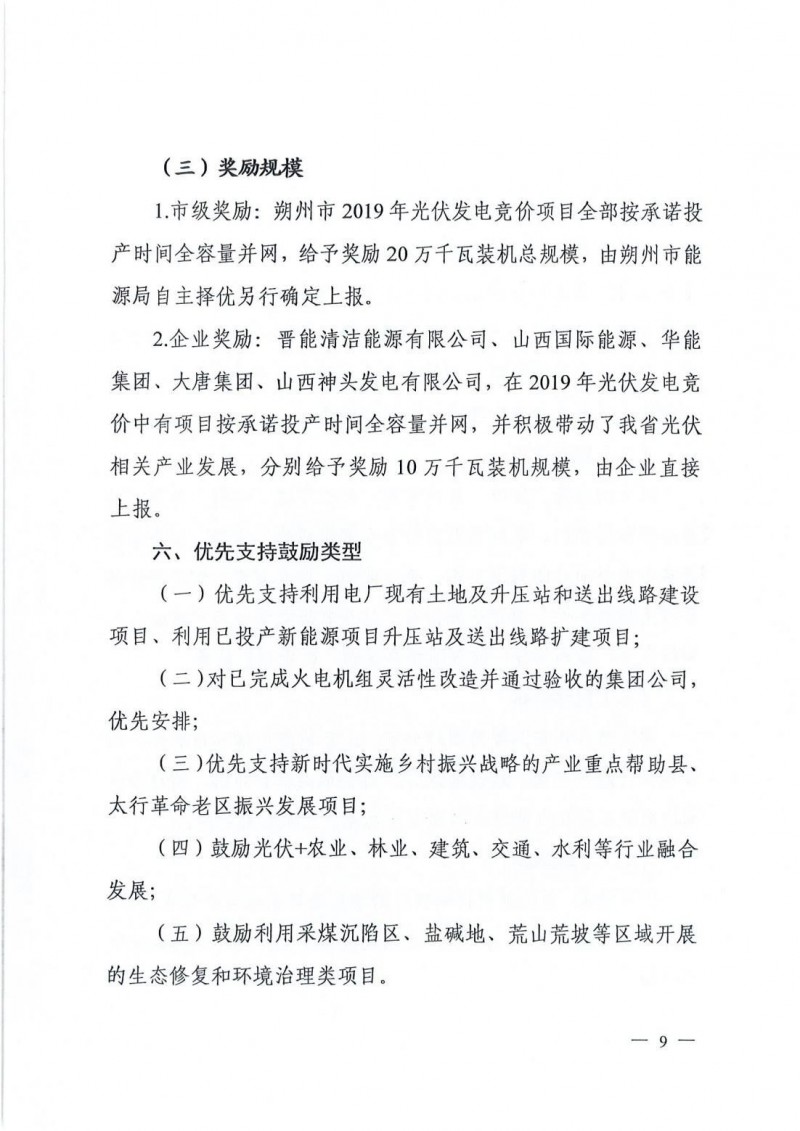 晉能清潔能源有限公司、山西國際能源、華能集團(tuán)、大唐集團(tuán)、山西神頭發(fā)電有限公司,在2019年光伏發(fā)電競價(jià)中有項(xiàng)目按承諾投產(chǎn)時(shí)間全容量并網(wǎng),并積極帶動(dòng)了山西省光伏相關(guān)產(chǎn)業(yè)發(fā)展,分別給予獎(jiǎng)勵(lì)10萬千瓦裝機(jī)規(guī)模,由企業(yè)直接上報(bào)。