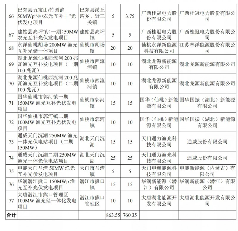 3)77個(gè)平價(jià)光伏項(xiàng)目,總規(guī)模863.55萬千瓦 ,擬配置規(guī)模760.35萬千瓦;