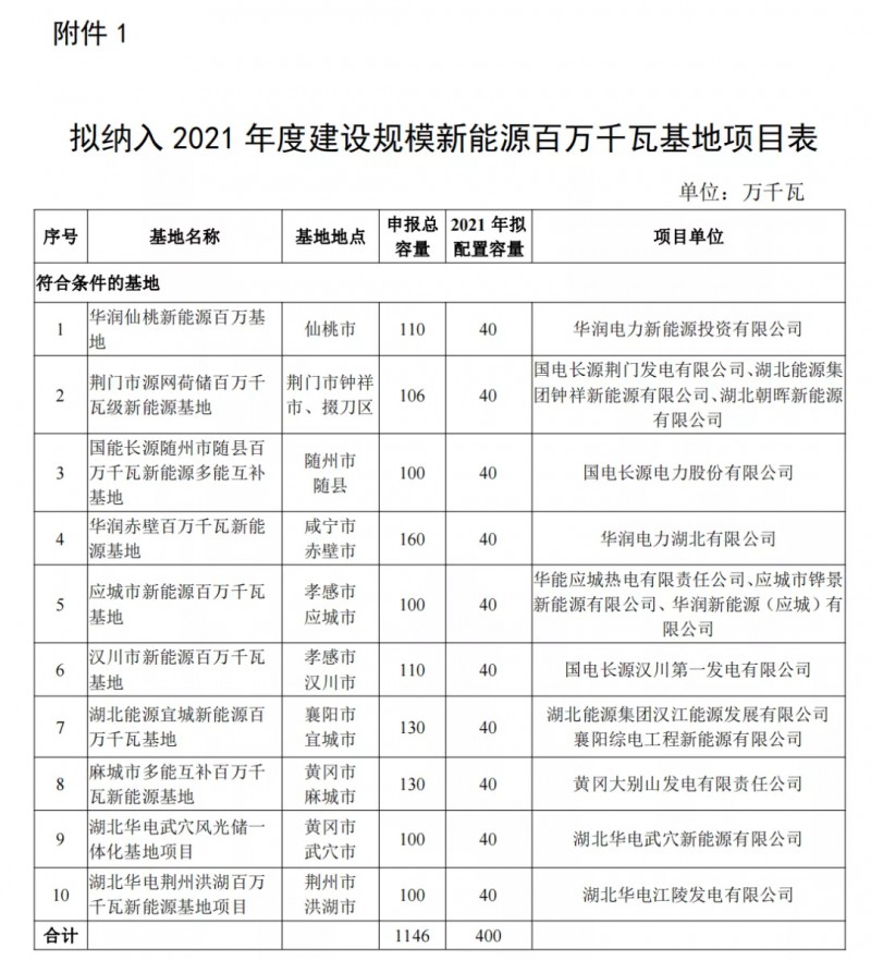 1)10新能源百萬千瓦基地項(xiàng)目,總規(guī)模1146萬千瓦 ,2021年實(shí)施400萬千瓦;