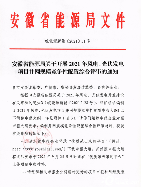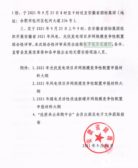 9月25日,安徽省招標(biāo)集團(tuán)將組織開(kāi)展安徽省2021年風(fēng)電、光伏發(fā)電項(xiàng)目并網(wǎng)規(guī)模競(jìng)爭(zhēng)性配置綜合性評(píng)審。評(píng)審工作全程采用電子化方式進(jìn)行,申報(bào)人員無(wú)需現(xiàn)場(chǎng)參與。