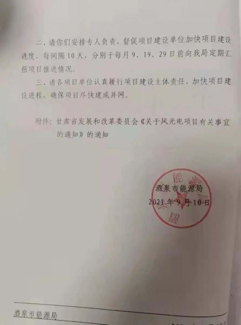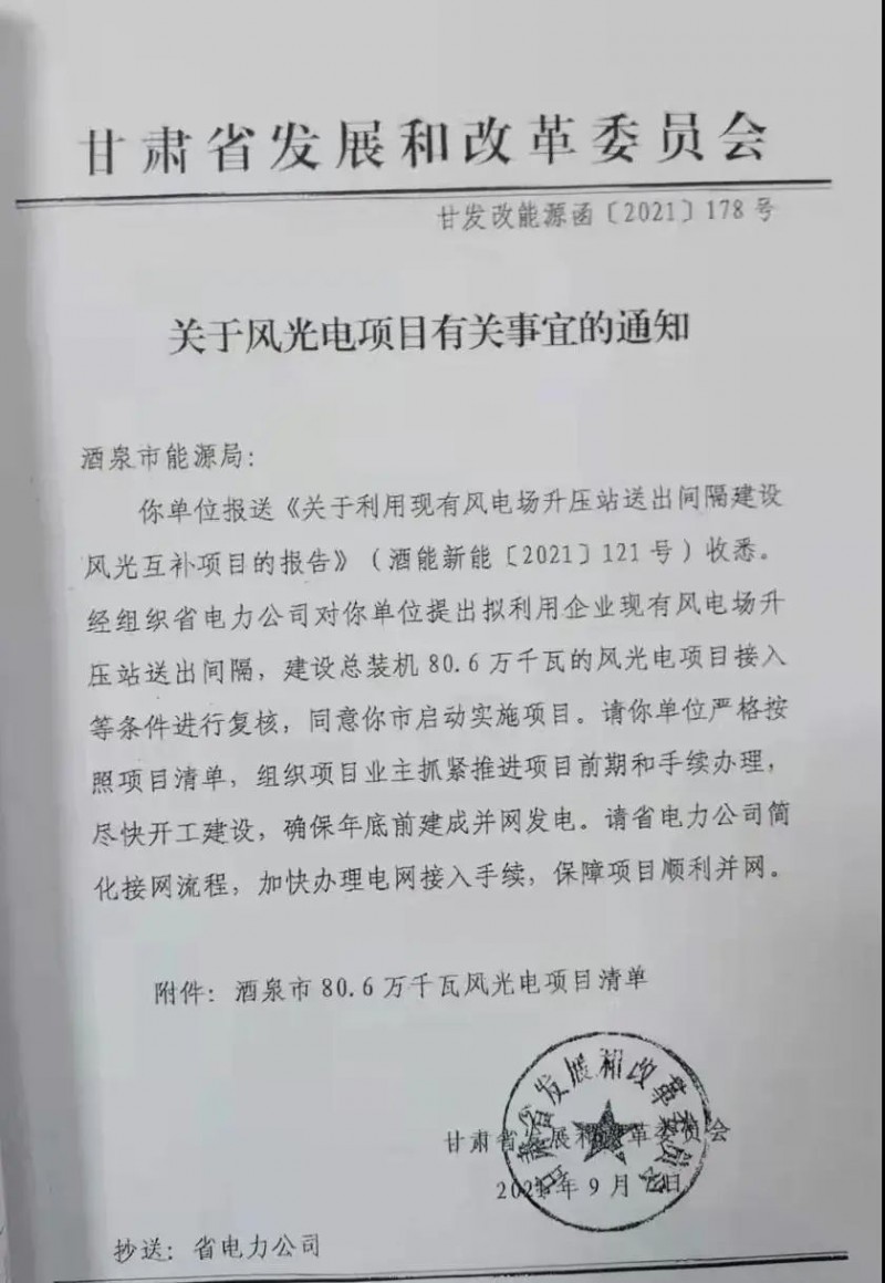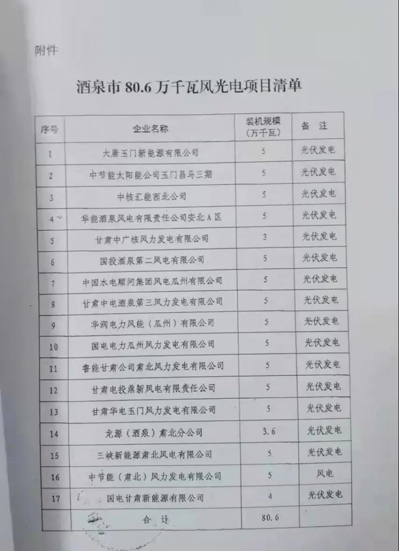 酒泉市2021年風、光建設規(guī)模為806MW,其中光伏756MW,風電50MW;