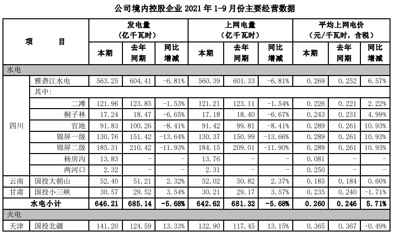 根據(jù)國投電力控股股份有限公司(以下簡稱公司)境內(nèi)控股企業(yè)初步統(tǒng)計, 2021年 7-9 月,公司境內(nèi)控股企業(yè)累計完成發(fā)電量491.30 億千瓦時,上網(wǎng)電量479.04 億千瓦時,與去年同期相比分別增加3.15%和3.02%。2021年1-9月,公司境內(nèi)控股企業(yè)累計完成發(fā)電量1148.29億千瓦時,上網(wǎng)電量1116.45億千瓦時, 與去年同期相比分別增加 2.28%和2.05%。 2021年7-9 月,公司境內(nèi)控股企業(yè)平均上網(wǎng)電價0.299 元/千瓦時,與去年同期相比增加了 2.04%。