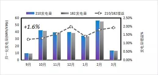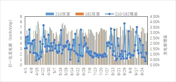 綜合2021年4月~9月數(shù)據(jù),210單面組件單瓦發(fā)電量較182單面組件高1.2%。