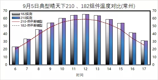 為探究組件真實戶外工作溫度,使用HIOKI熱電偶數(shù)據(jù)采集儀對組件進行工作溫度采集。實證結果顯示,210與對比測試樣件溫度幾乎無差異,根據(jù)輻照加權平均溫度,210組件甚至略低于對比組件0.5℃。使用PVsyst仿真,組件相同溫度系數(shù)的情況下,在常州,工作溫度每降低1℃,發(fā)電量提升約為0.2%。同時,選取9月5日典型天氣,將實測數(shù)據(jù)及實測氣象數(shù)據(jù)代入穩(wěn)態(tài)熱平衡模型,更證明了高電流、低開壓的210組件無明顯溫升,且在早晚輻照及溫度較低時,210組件組件工作溫度較低。