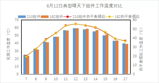 任選典型晴天下,組件工作溫度實測與模擬結果均顯示,210組件并無高工作溫度風險,且早晚低輻照時段,210組件溫度略有優(yōu)勢: