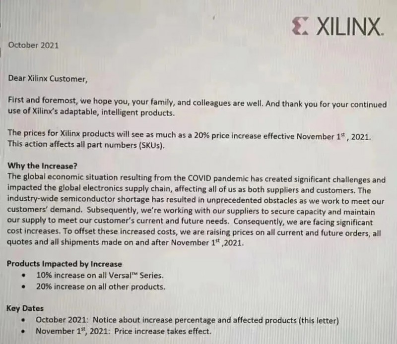 9月底,多家主要海外芯片生產(chǎn)商紛紛宣布,對(duì)IGBT和IC半導(dǎo)體等核心芯片展開(kāi)新一輪漲價(jià)。意法半導(dǎo)體表示,將在今年最后一個(gè)季度提高所有產(chǎn)品價(jià)格,包括現(xiàn)有庫(kù)存;安森美則是從10月初開(kāi)始,對(duì)部分產(chǎn)品漲價(jià)生效,新價(jià)格將適用于新訂單和現(xiàn)有積壓訂單;此外,賽靈思也發(fā)布通知稱,將會(huì)提高2021年11月1日及之后所有當(dāng)前和未來(lái)的訂單、所有報(bào)價(jià)和所有發(fā)貨的價(jià)格。