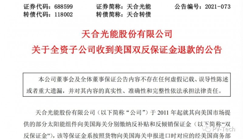 11月11日晚間,天合光能(688599.SH)發(fā)布公告稱,全資子公司Trina Solar (U.S.)收到美國雙反保證金退款合計1.756億美金,公司因利息所得將增加2021年度凈利潤約1.5億元人民幣。