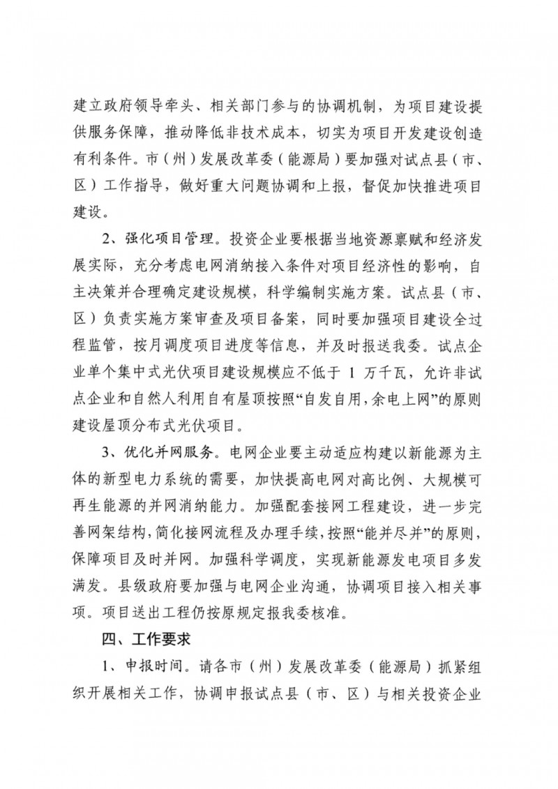 已納入國(guó)家試點(diǎn)的12個(gè)整縣屋頂分布式光伏試點(diǎn)縣,如縣(市、區(qū))政府和原開發(fā)企業(yè)按要求達(dá)成合作并按時(shí)上報(bào)相關(guān)材料的,可將試點(diǎn)范圍擴(kuò)大至含地面分布式和集中式在內(nèi)的全部光伏項(xiàng)目,一并納入試點(diǎn)范圍。