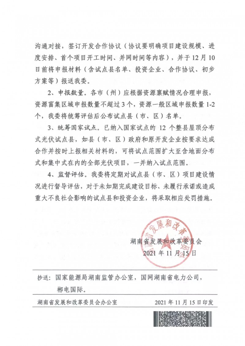 11月15日,湖南省發(fā)改委下發(fā)《關(guān)于開展整縣(市、區(qū))光伏開發(fā)試點(diǎn)的通知》,擬在全省范圍內(nèi)組織推進(jìn)一批整縣(市、區(qū))光伏開發(fā)試點(diǎn),高效整合縣域資源,結(jié)合多能互補(bǔ)協(xié)同發(fā)展。