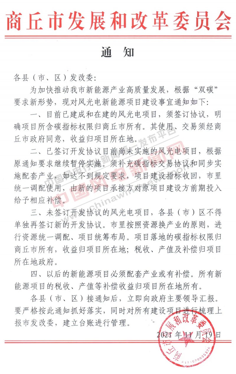 11月19日,商丘市發(fā)改委下發(fā)關(guān)于風(fēng)電光伏項目建設(shè)通知,通知要求: