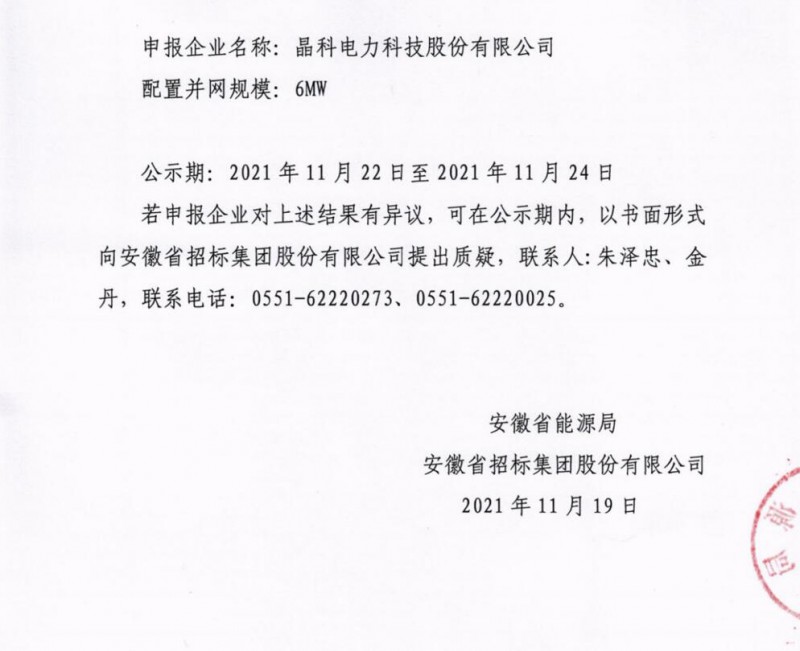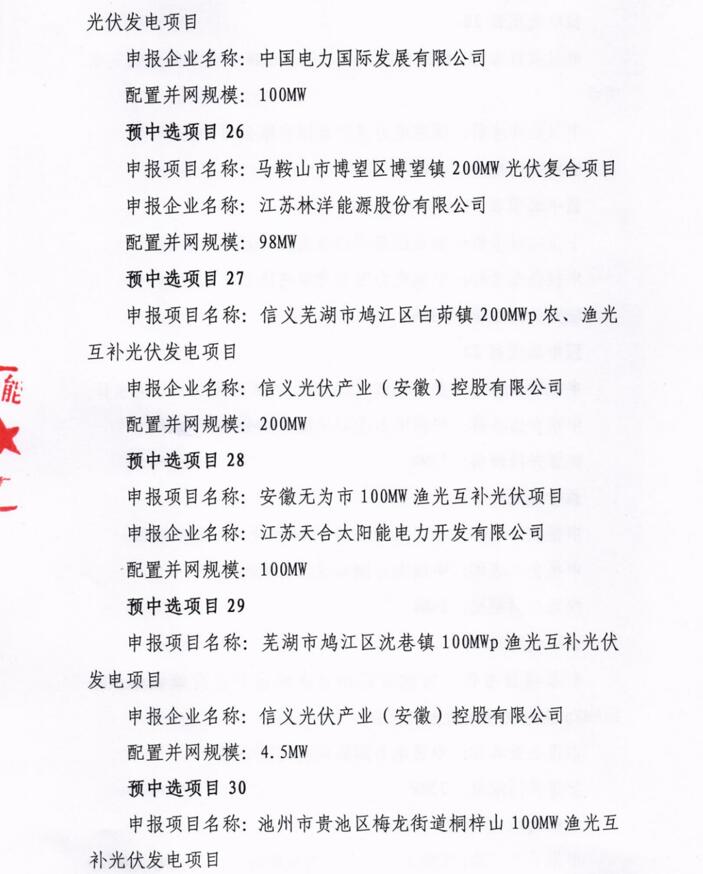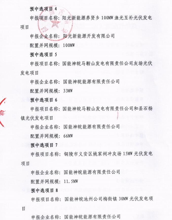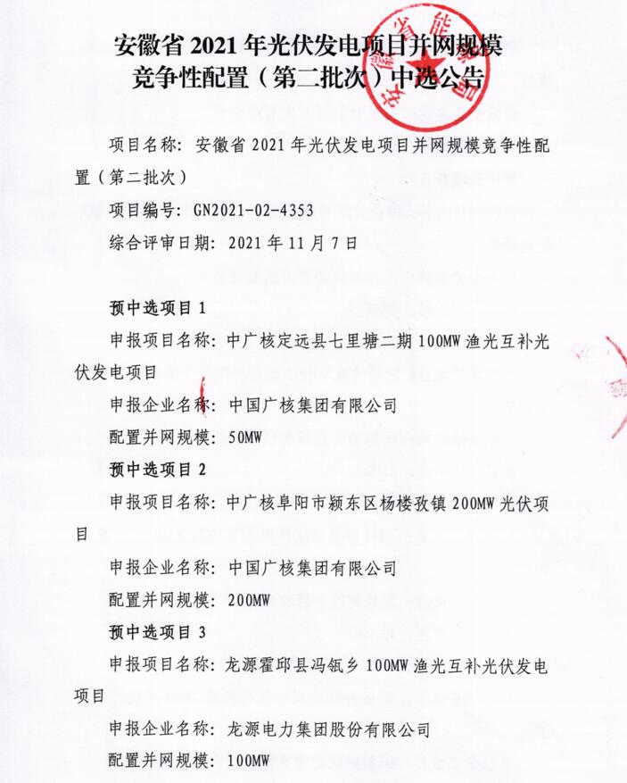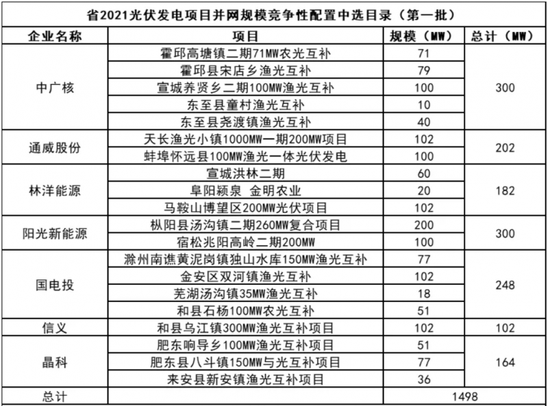 此前10月21日,安徽省能源局下發(fā)《2021年光伏發(fā)電項(xiàng)目并網(wǎng)規(guī)模競爭性配置(第一批次)中選公告》,規(guī)模共計(jì)1498MW。中廣核、陽光新能源、國家電投、通威、林洋、晶科、信義光能等7家企業(yè)中標(biāo)20個(gè)光伏第一批優(yōu)選項(xiàng)目。加上此次安徽省總共公示了4GW光伏、1.166GW風(fēng)電項(xiàng)目。
