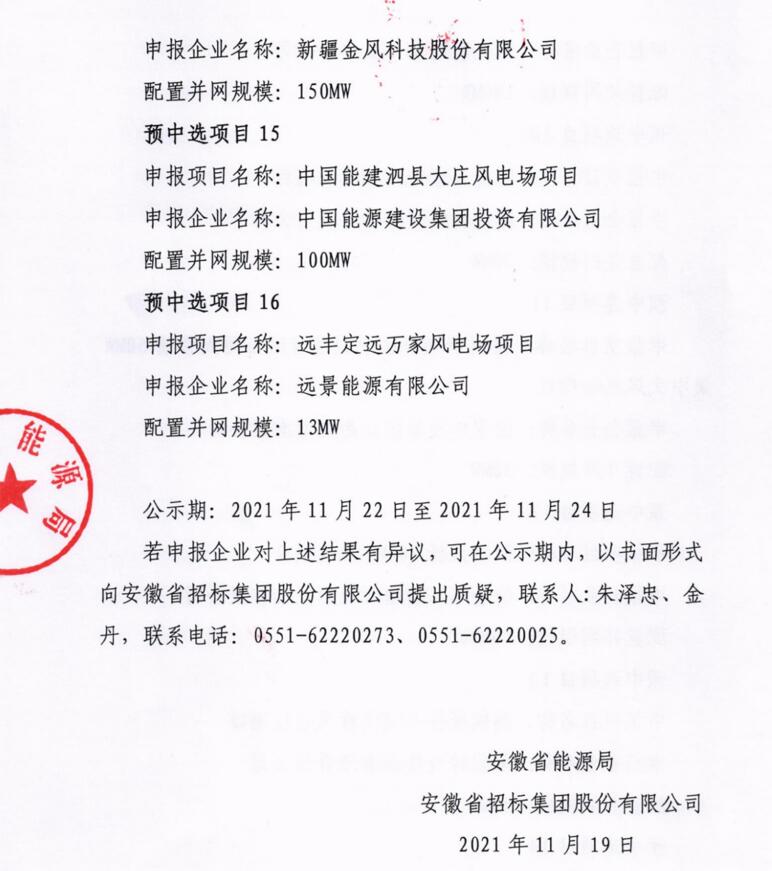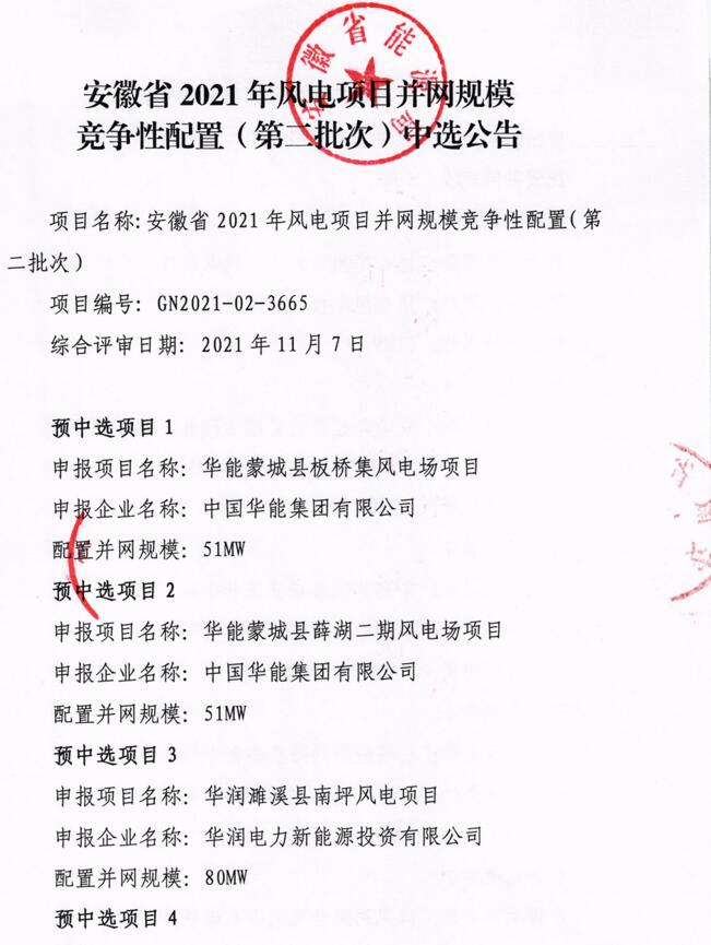 11月19日,安徽省能源局下發(fā)了《安徽省2021年光伏發(fā)電項(xiàng)目競爭性配置(第二批次)中選公告》和《安徽省2021年風(fēng)電項(xiàng)目競爭性配置(第二批次)中選公告》,其中,光伏30個(gè)項(xiàng)目總規(guī)模為2502MW;風(fēng)電6個(gè)項(xiàng)目總規(guī)模為1166MW。