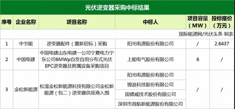 光伏逆變器采購(gòu)入圍企業(yè)有陽(yáng)光電源股份有限公司、上能電氣股份有限公司、錦浪科技股份有限公司、固德威技術(shù)股份有限公司、深圳市首航新能源股份有限公司;