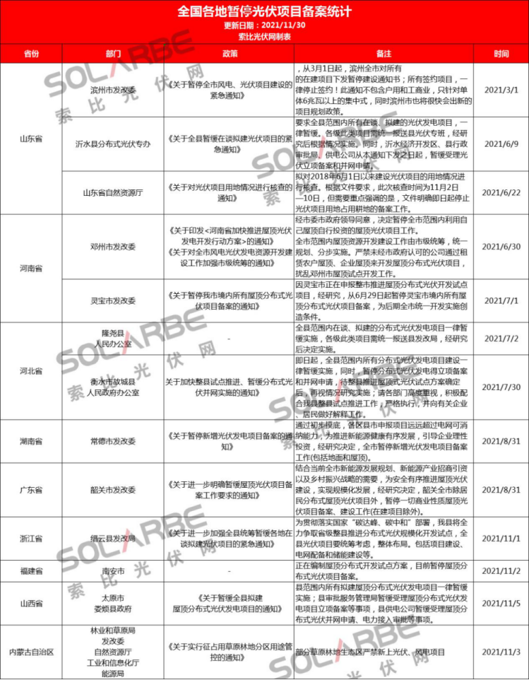 據(jù)索比光伏網(wǎng)統(tǒng)計,截至今年11月末,全國共有13個地區(qū)發(fā)布暫停申報工作的消息,此外,福建省南安市雖未有正式文件,但經(jīng)銷商爆料稱,當?shù)匾褵o法進行分布式光伏備案并網(wǎng)。