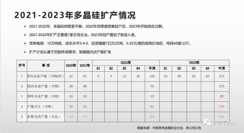 呂錦標(biāo)在報(bào)告里也公布了全球7家主要企業(yè)和4家新進(jìn)入企業(yè)的擴(kuò)產(chǎn)情況,預(yù)測(cè)2022年多晶硅供應(yīng)可以超過(guò)80萬(wàn)噸,比今年增加20萬(wàn)噸。主要產(chǎn)能集中在下半年投產(chǎn)。對(duì)應(yīng)明年200吉瓦的裝機(jī)預(yù)測(cè),多晶硅供應(yīng)大于需求。有望推動(dòng)價(jià)格下行。