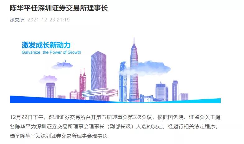深交所消息,12月22日下午,深圳證券交易所召開第五屆理事會(huì)第3次會(huì)議,根據(jù)國(guó)務(wù)院、證監(jiān)會(huì)關(guān)于提名陳華平為深圳證券交易所理事會(huì)理事長(zhǎng)(副部長(zhǎng)級(jí))人選的決定,經(jīng)履行相關(guān)法定程序,選舉陳華平為深圳證券交易所理事會(huì)理事長(zhǎng)。