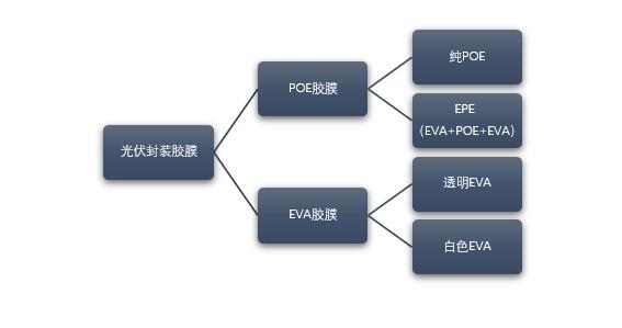當前光伏膠膜市場主流產(chǎn)品為EVA膠膜和POE膠膜兩種,其中EVA膠膜又分成透明EVA膠膜和白色EVA膠膜,POE膠膜則包含純POE膠膜和共擠POE膠膜(即EPE膠膜)。
