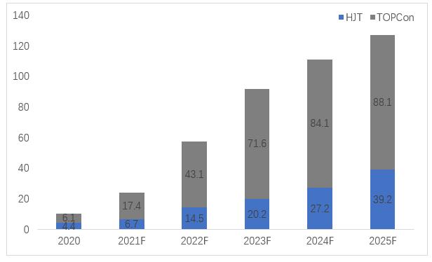 根據(jù)中國光伏行業(yè)的數(shù)據(jù),2020年P(guān)型PERC單晶電池量產(chǎn)轉(zhuǎn)化效率行業(yè)均值為22.8%,2021年有望超越23%,基本已經(jīng)達到了量產(chǎn)性能極限,N型電池接棒P型漸行漸近。