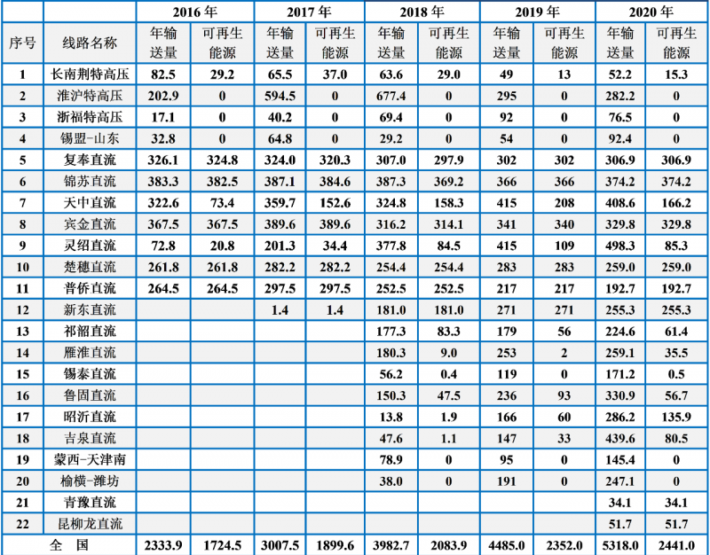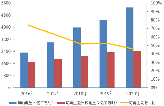 “十三五”期間,我國特高壓工程建設(shè)進展迅速,特高壓線路輸送電量和輸送可再生能源電量逐年增加,“西電東送”工程穩(wěn)步向前,但輸送可再生能源電量的比重反而在下降,2020年我國22條特高壓輸送通道平均可再生能源占比為46%,創(chuàng)下近五年新低。2021年10月24日,國務(wù)院印發(fā)的《2030年前碳達峰行動方案》提出“嚴控跨區(qū)外送可再生能源電力配套煤電規(guī)模,新建通道可再生能源電量比例原則上不低于50%。”可以預(yù)見,隨著全社會對碳達峰、碳中和目標形成共識以及國家政策引導(dǎo),清潔能源占比將持續(xù)提升。