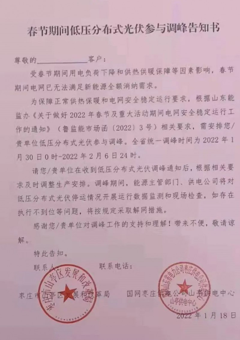 隨后,各地級(jí)市也根據(jù)精神,下發(fā)了《春節(jié)期間低壓分布式光伏參與調(diào)峰告知書(shū)》。