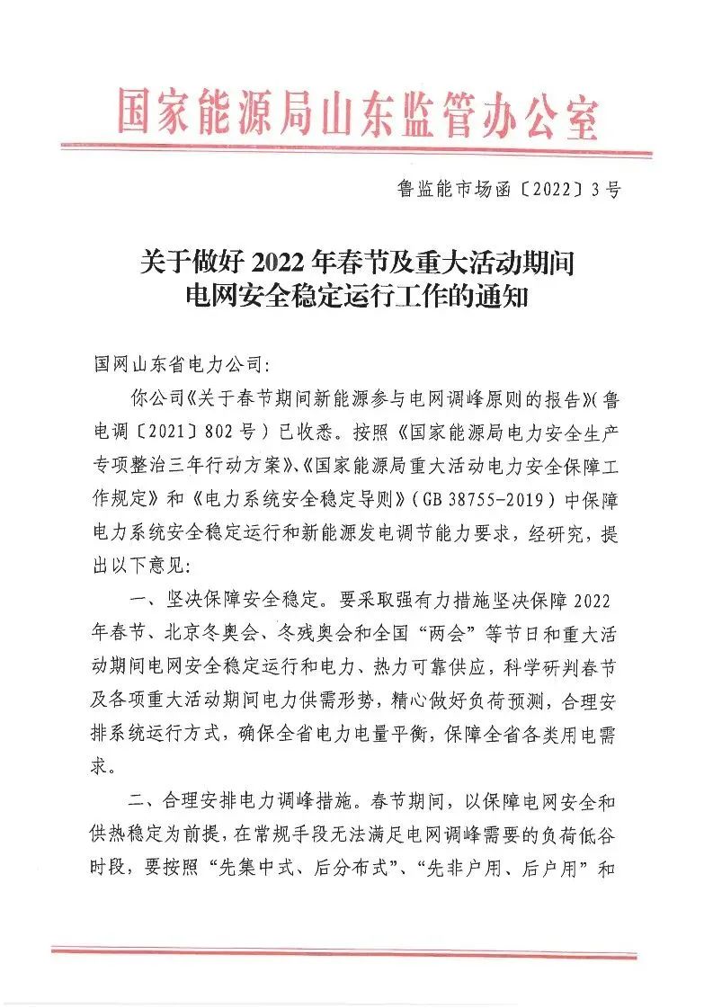2022年1月22日,國(guó)家能源局山東監(jiān)管辦公室發(fā)布《關(guān)于做好 2022年春節(jié)及重大活動(dòng)期間電網(wǎng)安全穩(wěn)定運(yùn)行工作的通知》,提出: