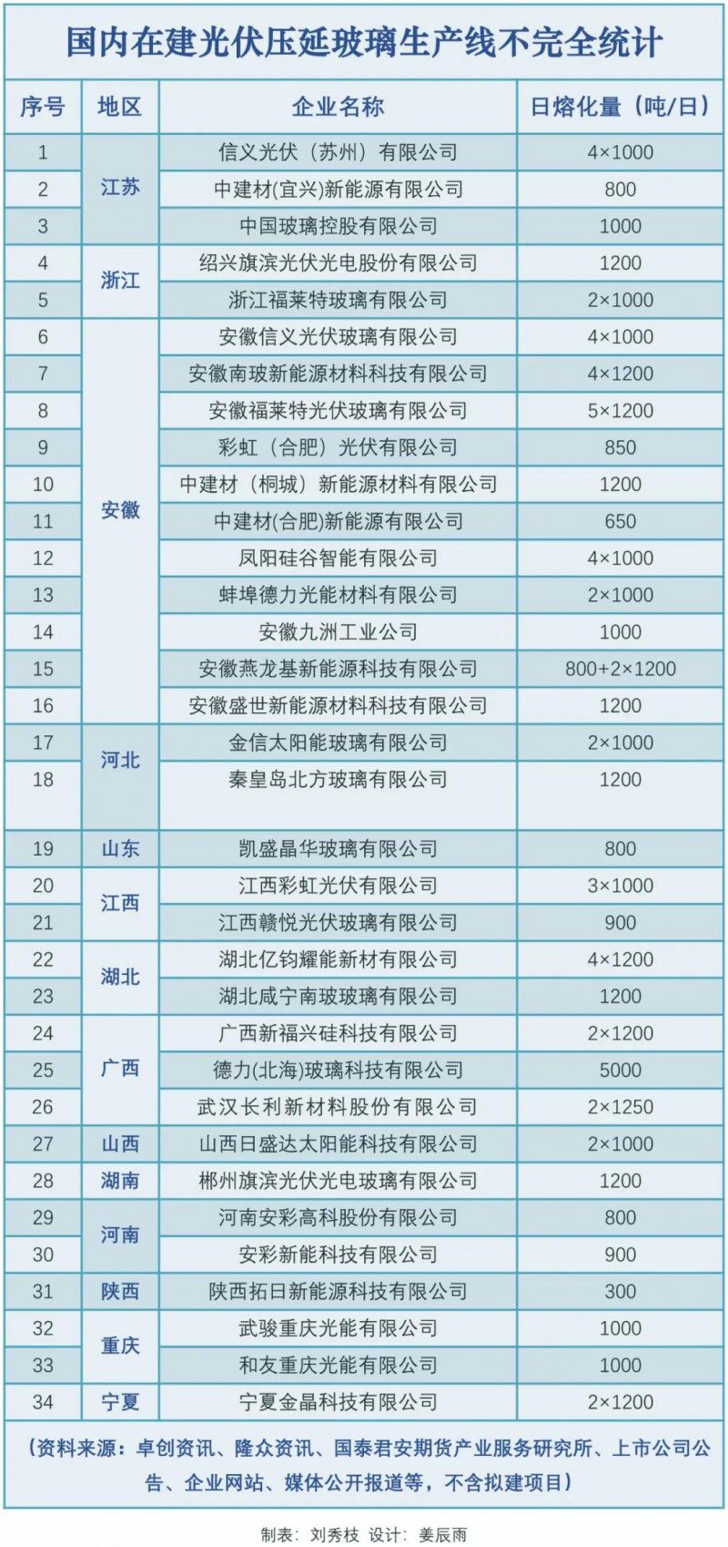 在江西,彩虹新能源規(guī)劃建設(shè)10座1000噸/日的光伏壓延玻璃生產(chǎn)線,3座已開(kāi)工;在安徽和江蘇,信義光能各有4座1000噸/日的生產(chǎn)線正在建設(shè);廣西北海正加快打造硅科技及光伏玻璃產(chǎn)業(yè)全產(chǎn)業(yè)鏈集群,云南曲靖提出要打造“世界光伏之都”……