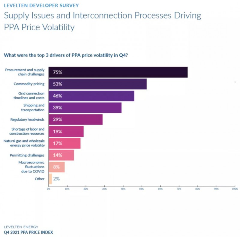 上述創(chuàng)紀(jì)錄的太陽(yáng)能光伏的采購(gòu)是在光伏成本上升的情況下發(fā)生的。LevelTen Energy的一項(xiàng)調(diào)查表明,由于需求增加、宏觀經(jīng)濟(jì)波動(dòng)、供應(yīng)鏈問(wèn)題以及其他因素的影響,光伏成本從 2020 年初開(kāi)始上漲。據(jù)LevelTen Energy 的最新報(bào)告, 2021 年第四季度購(gòu)電協(xié)議( PPA) 價(jià)格指數(shù)顯示光伏價(jià)格上漲了 5.7%,達(dá)到34.25 美元/兆瓦時(shí)。