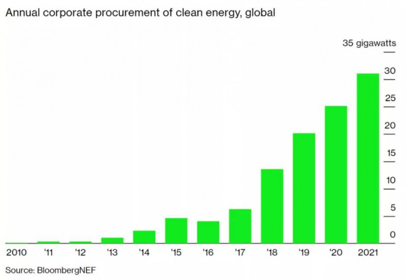 彭博新能源財(cái)經(jīng)報(bào)道,2021年有 67 家公司加入了 RE100(100%可再生能源倡議),總計(jì)有 355 家公司承諾使用 100% 可再生能源。2021年全球企業(yè)采購(gòu)可再生能源合同的容量創(chuàng)下了 31GW 的新紀(jì)錄。其中大部分產(chǎn)能是在美洲采購(gòu)的,其中 17GW 來(lái)自美國(guó)的企業(yè),3.3GW 來(lái)自北美和南美的其他國(guó)家的企業(yè)。