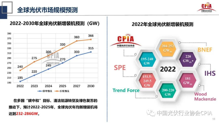 昨日由中國(guó)光伏行業(yè)協(xié)會(huì)組織召開(kāi)的2021年發(fā)展回顧與2022年形勢(shì)展望線上研討會(huì)上,名譽(yù)理事長(zhǎng)王勃華在報(bào)告中對(duì)于2022年光伏市場(chǎng)前景給出樂(lè)觀預(yù)期,多家機(jī)構(gòu)也給出國(guó)內(nèi)新增裝機(jī)75GW以上、全球新增200GW以上的預(yù)測(cè)??紤]到光伏電站項(xiàng)目的“組件-逆變器容配比”普遍大于1,全年對(duì)光伏組件的需求很可能在250GW以上,其中晶硅組件不少于230GW。