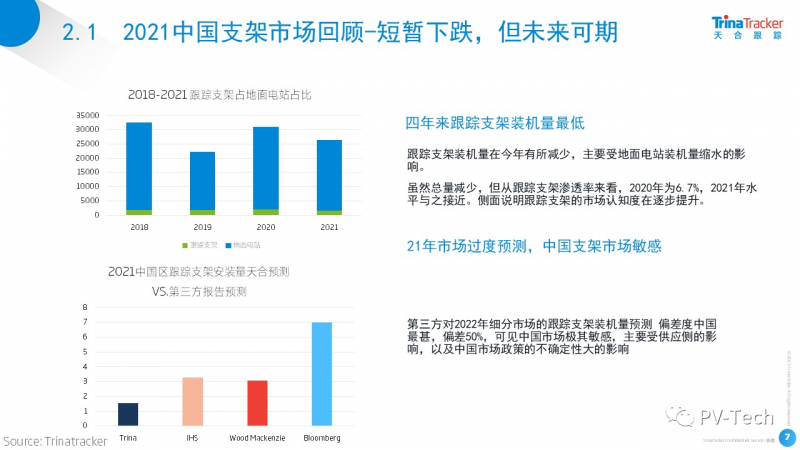 中國跟蹤支架市場2021年安裝量為近四年來最低,主要原因是受國內(nèi)地面電站安裝量影響,跟蹤支架的滲透率較2020年僅降低0.78%,基本持平。