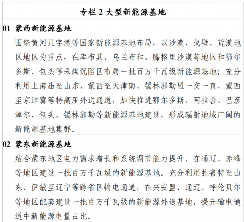 因地制宜推進太陽能熱發(fā)電發(fā)展。總結(jié)首批太陽能熱發(fā)電示范項目建設(shè)經(jīng)驗,發(fā)揮太陽能熱發(fā)電儲能調(diào)節(jié)能力和系統(tǒng)支撐能力,因地制宜建設(shè)太陽能熱發(fā)電項目。充分發(fā)揮太陽能熱發(fā)電在電力系統(tǒng)中調(diào)峰、調(diào)頻、儲能等多元功能,統(tǒng) 籌推動太陽能熱發(fā)電與風(fēng)電光伏基地一體化建設(shè)運行,為新能源高比例自用和外送提供支撐,力爭“十四五”期間新增并網(wǎng)太陽能熱發(fā)電項目 50 萬千瓦。加快推進新型儲能技術(shù)規(guī)模化應(yīng)用。探索采用自建、合建、租賃和共享等多元化模式,加快推動新型儲能在發(fā)電側(cè)、 電網(wǎng)側(cè)、用戶側(cè)的規(guī)?;瘧?yīng)用,實現(xiàn)新能源與新型儲能的協(xié)同發(fā)展,原則上新建新能源項目要配置 15%(2 小時)以上的儲能設(shè)施。研究出臺存量新能源項目增配儲能的管理辦法,推動已并網(wǎng)的新能源項目增配儲能設(shè)施,提高消納和調(diào)峰能力。在充分發(fā)揮電力外送通道配套火電機組深度調(diào)峰能力的基礎(chǔ)上,合理規(guī)劃建設(shè)送端配套新型儲能設(shè)施,支撐大規(guī)模風(fēng)、光等可再生能源電源接入,提升外送通道可再生能源電量占比。二、充分提升可再生能源就地消納水平加快配套電網(wǎng)建設(shè)。優(yōu)化升級電網(wǎng)主網(wǎng)架,解決電網(wǎng)結(jié)構(gòu)性問題,提升電力互濟能力,提高電網(wǎng)運行效率和安全穩(wěn)定水平。加快推動新能源送出工程建設(shè),滿足新能源大規(guī)模開發(fā)的匯集與送出需求。推動配電網(wǎng)擴容改造和智能化升 級,提升配電網(wǎng)柔性開放接入能力、靈活控制能力和抗擾動能力,增加電網(wǎng)就地就近平衡能力,構(gòu)建適應(yīng)分布式可再生能源并網(wǎng)和多元負荷需要的智能配電網(wǎng)。提升系統(tǒng)調(diào)節(jié)能力。積極推進煤電靈活性改造,推動自備電廠主動參與調(diào)峰,加快建設(shè)天然氣調(diào)峰電站,充分提升系統(tǒng)調(diào)節(jié)能力。優(yōu)化電力調(diào)度運行,合理安排系統(tǒng)開機方式, 動態(tài)調(diào)整各類電源發(fā)電計劃,探索推進多種電源聯(lián)合調(diào)度。創(chuàng)新調(diào)度運行與市場機制,促進可再生能源在省級電網(wǎng)內(nèi)就地消納。三、穩(wěn)步有序推動可再生能源外送消納充分發(fā)揮自治區(qū)可再生能源資源優(yōu)勢和區(qū)位優(yōu)勢,按照提升一批、投產(chǎn)一批、開工一批的發(fā)展思路,努力提高輸電 通道中新能源電量的占比,提高特高壓輸電通道利用率,大力提升可再生能源外送消納能力,有序推動國家級新能源電力供應(yīng)保障基地建設(shè),助力全國碳達峰碳中和。“十四五” 期間,規(guī)劃新增新能源外送基地 2900 萬千瓦,力爭累計投產(chǎn) 3900 萬千瓦。加快推動已批復(fù)新能源外送基地投產(chǎn)運行。加快推動錫林郭勒盟“一交一直”一期、上海廟至山東一期、扎魯特至青州特高壓輸電通道配套新能源基地、烏蘭察布風(fēng)電基地等已批復(fù)新能源基地建設(shè)進度,力爭 2025 年前建成投產(chǎn) 1500 萬千瓦左右。提升既有外送通道中新能源電量占比。提高自治區(qū)可再生能源外送規(guī)模,在蒙西至天津南交流特高壓、上海廟至山 東直流特高壓、錫林郭勒盟交直流特高壓等既有特高壓外送 輸電通道以及傳統(tǒng)火電廠外送專線基礎(chǔ)上,統(tǒng)籌送端周邊地區(qū)資源條件和環(huán)境約束,合理優(yōu)化風(fēng)能、太陽能資源配置方 案,增配布局一批新能源基地,大幅提高存量外送輸電通道中可再生能源占比和通道利用效率,“十四五”期間建成外送新能源 1900 萬千瓦。積極推進新建蒙西外送通道配套新能源基地開工建設(shè)。統(tǒng)籌優(yōu)化蒙西地區(qū)風(fēng)能、太陽能資源和接入條件,在資源稟賦較好、開發(fā)建設(shè)條件優(yōu)越、具備持續(xù)整裝開發(fā)條件的地區(qū), 推進風(fēng)能、太陽能、煤炭等多能互補發(fā)展,有序建設(shè)一批百萬千瓦級新能源基地,實現(xiàn)高比例可再生能源外送,力爭2025 年前推動開工配套新能源基地 1000 萬千瓦。