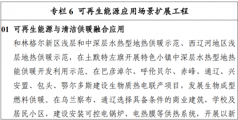 四、廣泛擴展可再生能源應(yīng)用場景實施火電靈活性改造。加快存量煤電改造升級,推廣深度調(diào)峰技術(shù)應(yīng)用,積極推進現(xiàn)役煤電機組實施靈活性改造, 鼓勵新建煤電機組靈活性制造,降低新建煤電機組最小技術(shù)出力水平,提升電力系統(tǒng)整體消納能力,促進新能源大規(guī)模開發(fā)和高效利用,引導(dǎo)煤電由主力電源逐步向“支撐型”、“調(diào) 節(jié)型”電源轉(zhuǎn)變。推進工業(yè)園區(qū)可再生替代。充分挖掘燃煤自備電廠園區(qū)的電源靈活調(diào)節(jié)能力和負荷側(cè)需求響應(yīng)能力,推動園區(qū)自備電廠參與調(diào)峰,改變單一依靠自備火電的傳統(tǒng)供能方式,因地制宜推動風(fēng)電、光伏建設(shè),鼓勵集中式與分布式并舉,在 不占用公共電網(wǎng)的消納空間且保證用能安全的前提下實現(xiàn) 新能源全額自發(fā)自用,逐步實現(xiàn)園區(qū)用能清潔化。開展低碳工業(yè)園區(qū)示范。鼓勵具備新增負荷的園區(qū)開展低碳工業(yè)園示范項目,以近零碳用能為目標(biāo),率先開展全清潔能源供電,提升園區(qū)整體能效。通過自建分布式、新能源專線供電、綠色電力交易、綠證交易等多種方式,實現(xiàn)園區(qū)新增用電需求主要由新能源滿足。同時,鼓勵園區(qū)通過配置儲能等措施,保證與園區(qū)負荷的匹配響應(yīng)和高比例自平衡, 不占用公共電網(wǎng)消納空間。推廣“綠電+綠氫”發(fā)展新模式。鼓勵采用具有適應(yīng)可再生能源出力波動的綠色制氫技術(shù),加快推進風(fēng)光氫儲一體化示范,推廣氫燃料電池汽車在礦山、物流、公交等領(lǐng)域的規(guī)模化應(yīng)用,積極探索氫能在冶金、化工、交通等領(lǐng)域的應(yīng)用。開展源網(wǎng)荷儲一體化示范。充分挖掘和釋放生產(chǎn)側(cè)、消費側(cè)調(diào)節(jié)能力,最大化發(fā)揮負荷側(cè)調(diào)節(jié)響應(yīng)能力,就近合理配套新能源,加強源網(wǎng)荷儲多向互動,通過電價優(yōu)勢帶動儲能、大數(shù)據(jù)、新能源、新材料等行業(yè)全產(chǎn)業(yè)鏈發(fā)展。加快烏蘭察布、通遼源網(wǎng)荷儲一體化示范工程建設(shè),提升本地電源支撐,有效緩解供電缺口,推動局部新能源就近消納,不占用公共電網(wǎng)調(diào)峰和消納空間,提升新能源開發(fā)利用水平。持續(xù)推廣可再生能源清潔供暖。發(fā)揮自治區(qū)風(fēng)能、光伏、農(nóng)林、地?zé)豳Y源優(yōu)勢,建立多元化可再生能源清潔供暖體系, 促進環(huán)境質(zhì)量和人民生活條件改善。在呼包鄂城市群積極推動中深層地?zé)崮芤?guī)模化供暖示范,創(chuàng)新城市用能新模式。在蒙東地區(qū)發(fā)展生物質(zhì)熱電聯(lián)產(chǎn)項目,探索以農(nóng)林生物質(zhì)、生物質(zhì)成型燃料等為燃料的生物質(zhì)鍋爐供熱方式,有效保護城鄉(xiāng)環(huán)境。在呼和浩特、包頭、烏蘭察布、通遼等地,開展清潔電供暖示范。大力發(fā)展以新能源為主的綜合能源應(yīng)用。結(jié)合配電網(wǎng)、燃氣網(wǎng)、熱力網(wǎng)等能源網(wǎng)絡(luò),綜合可再生能源、儲能、信息通訊等先進技術(shù),推動分布式可再生能源高效靈活接入與生產(chǎn)消費一體化,建設(shè)冷熱水電氣供應(yīng)的區(qū)域綜合能源系統(tǒng)。