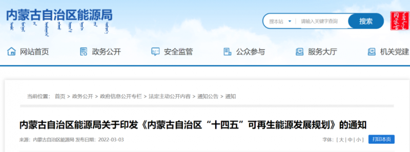 2022年3月2日,內(nèi)蒙古自治區(qū)能源局關(guān)于印發(fā)《內(nèi)蒙古自治區(qū)“十四五”可再生能源發(fā)展規(guī)劃》,提出:"十四五"末,內(nèi)蒙古可再生能源發(fā)電裝機達到 1.35 億千瓦以上,其中風(fēng)電 8900 萬千瓦、光伏發(fā)電 4500 萬千瓦,相當(dāng)于新增風(fēng)電項目5115萬千瓦,光伏項目3262萬千瓦,共8377萬千瓦,包含本地消納和外送兩類。平均利用率保持在 90%以上。同時,將依據(jù)國土空間規(guī)劃,完善可再生能源空間用途管制規(guī)則,保障可再生能源開發(fā)利用合理的用地空間需求。落實草原林地征占用分區(qū)管控政策,保障可再生能源項目使用草原林地需求。規(guī)范土地性質(zhì)認定,明確林草等不同地類的用地標(biāo)準。