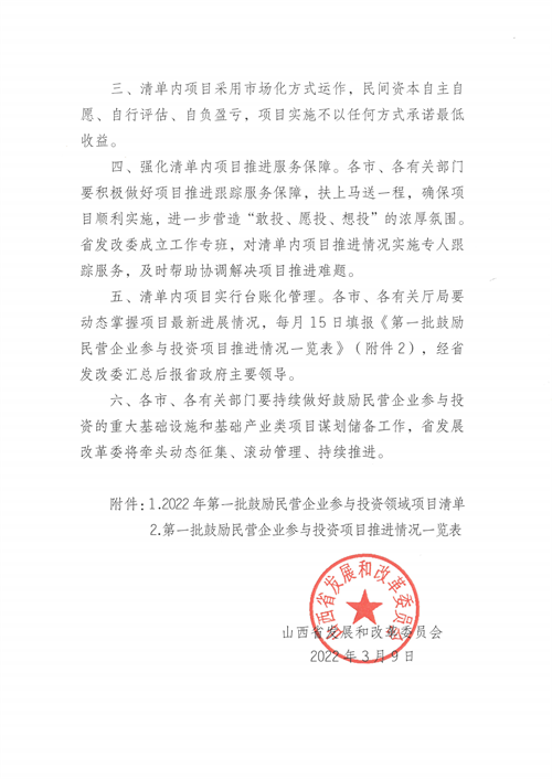 3月14日,山西省發(fā)改委關(guān)于發(fā)布2022年第一批鼓勵(lì)民營(yíng)企業(yè)參與投資領(lǐng)域項(xiàng)目清單的通知,按照山西省委省政府關(guān)于實(shí)施市場(chǎng)主體倍增工程重要部署,為進(jìn)一步放寬民營(yíng)企業(yè)市場(chǎng)準(zhǔn)入,鼓勵(lì)引導(dǎo)省內(nèi)外民間資本投資山西、建設(shè)山西,經(jīng)報(bào)請(qǐng)省政府同意,現(xiàn)將2022年第一批鼓勵(lì)民營(yíng)企業(yè)參與投資領(lǐng)域項(xiàng)目清單(共50個(gè)項(xiàng)目,含打包項(xiàng)目)予以發(fā)布。本次發(fā)布的領(lǐng)域和項(xiàng)目主要面向民營(yíng)企業(yè),所有項(xiàng)目(包含子項(xiàng)目)民企投資比例不得低于30%,此次在新能源領(lǐng)域中,共有4個(gè)項(xiàng)目入選。