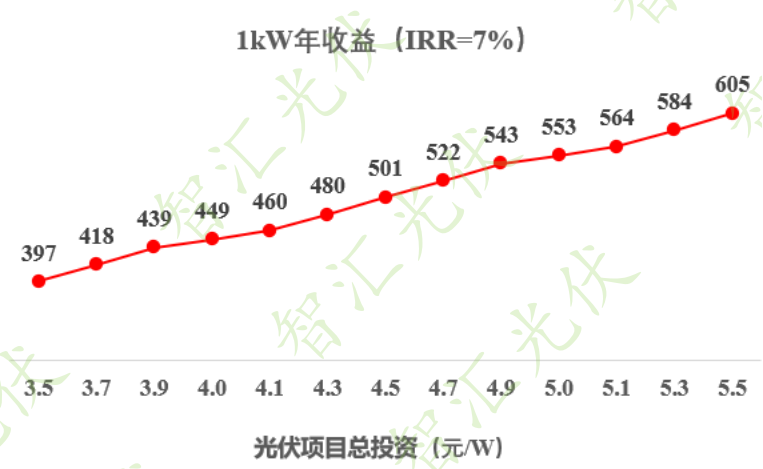 假設山東某地光伏項目,首年滿發(fā)小時數(shù)為1350小時,山東的脫硫煤電價電價為0.3949元/kWh;該項目1kW年收益 = 1350*0.3949=533根據(jù)上表,533應該介于總投資4.7元/W與4.9元/W之間。因此,項目總投資要控制在4.8元/W以內(nèi)時,該項目全投資內(nèi)部收益率可以達到7%以上。假設內(nèi)蒙古蒙西某地光伏項目,首年滿發(fā)小時數(shù)為1700小時,蒙西的脫硫煤電價電價為0.2829元/kWh;該項目1kW年收益 = 1700*0.2829=481根據(jù)上表,481對應的總投資為4.3元/W。因此,項目總投資要控制在4.3元/W以內(nèi)時,該項目全投資內(nèi)部收益率可以達到7%以上。如果所在企業(yè)收益率標準不是7%,而是6.5%,用同樣的方法,也可以計算出“1kW年收益”的對應數(shù)值。