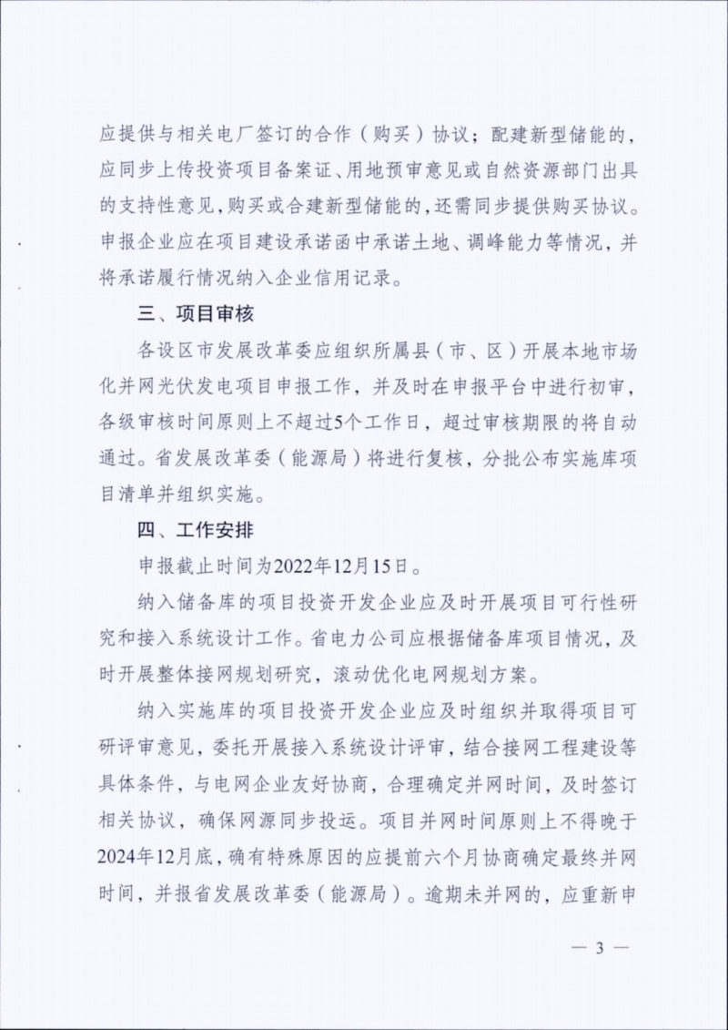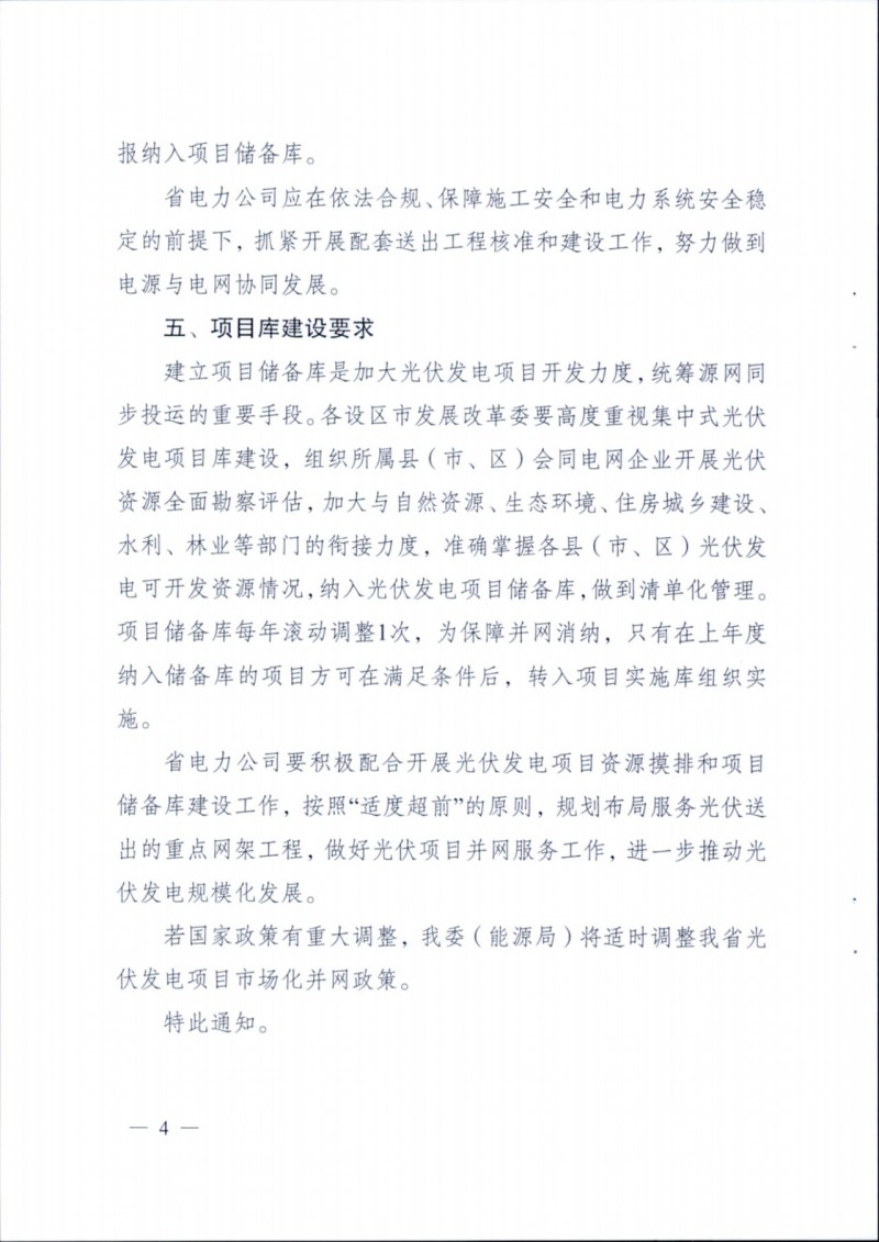 儲(chǔ)備庫(kù)項(xiàng)目要及時(shí)開(kāi)展可行性研究和接入系統(tǒng)設(shè)計(jì)工作,省電力公司要根據(jù)儲(chǔ)備庫(kù)項(xiàng)目及時(shí)開(kāi)展整體接網(wǎng)規(guī)劃和研究。實(shí)施項(xiàng)目要合理確定并網(wǎng)時(shí)間,最晚在2024年12月底并網(wǎng),如有特殊情況可申請(qǐng)延遲半年。省電力公司要按照"適度超前”的原則,規(guī)劃布局服務(wù)光伏送出的重點(diǎn)網(wǎng)架工程。