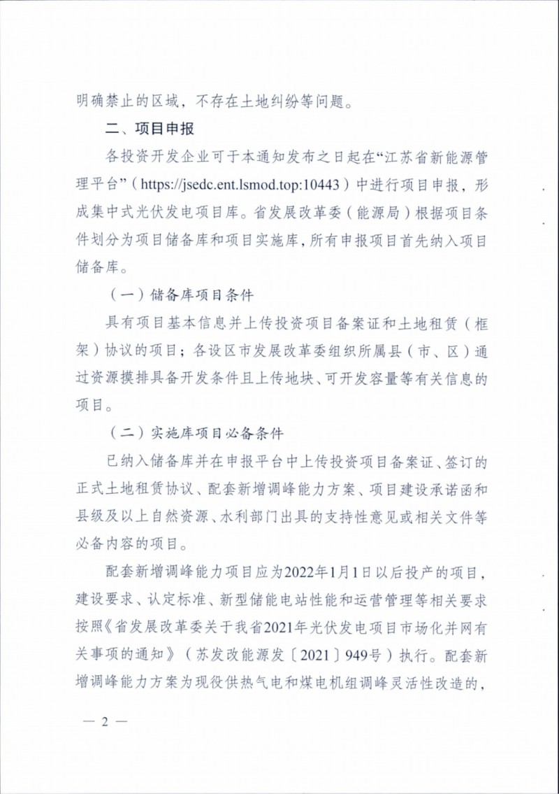 根據(jù)文件,本次申報(bào)主要為地面集中式光伏電站,項(xiàng)目應(yīng)選址明確,不涉及永久基本農(nóng)田、自然保護(hù)區(qū)以及無(wú)土地糾紛等。投資企業(yè)需在“江蘇省新能源管理平臺(tái)”進(jìn)行申報(bào),形成項(xiàng)目庫(kù),項(xiàng)目庫(kù)分為儲(chǔ)備和實(shí)施兩種類型。