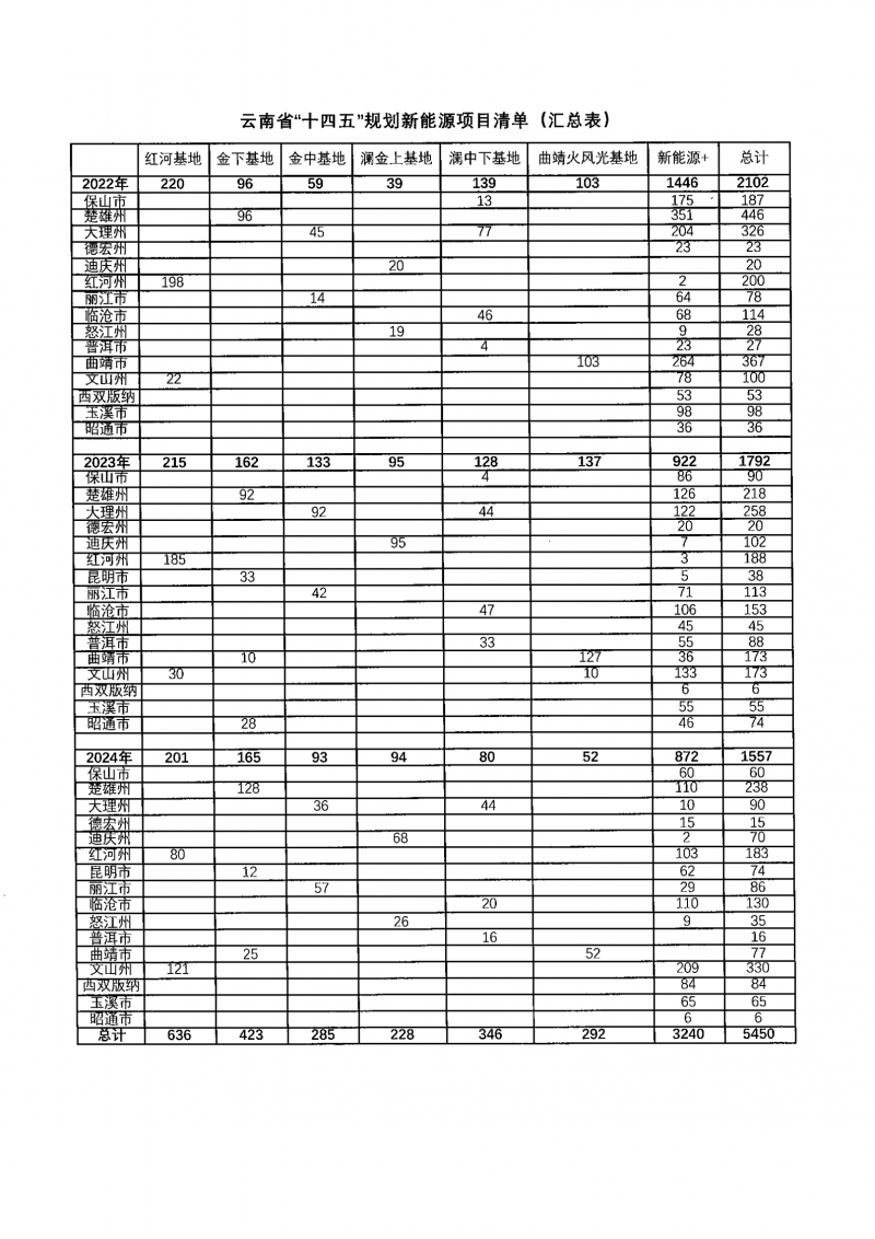 5450萬千瓦項目主要包括紅河基地636萬千瓦、金下基地423萬千瓦、金中基地285萬千瓦、瀾金上基地228萬千瓦、瀾中下基地346萬千瓦、曲靖火風(fēng)光基地292萬千瓦、新能源+3240萬千瓦。