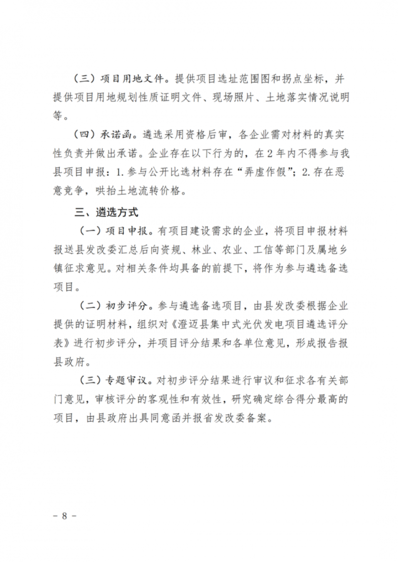 4月11日,澄邁縣發(fā)展和改革委員會(huì)、澄邁縣自然資源和規(guī)劃局、澄邁縣農(nóng)業(yè)農(nóng)村局、澄邁縣工業(yè)信息化和科學(xué)技術(shù)局聯(lián)合發(fā)布了《關(guān)于進(jìn)一步規(guī)范集中式光伏發(fā)電項(xiàng)目建設(shè)管理的通知》。本通知自2022年5月12日起施行,有效期2年。
