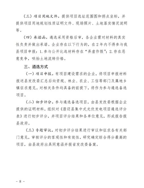 文件規(guī)定了澄邁縣集中式光伏發(fā)電項(xiàng)目應(yīng)納入省內(nèi)“十四五”能源發(fā)展規(guī)劃總規(guī)模,在全縣范圍內(nèi)實(shí)行總量控制,每年新增建設(shè)的集中式光伏發(fā)電項(xiàng)目總規(guī)模原則上不超過(guò)10萬(wàn)千瓦。對(duì)有建設(shè)需求的企業(yè),向縣發(fā)改委集中進(jìn)行申報(bào),通過(guò)組織比選的方式遴選綜合評(píng)價(jià)最高的項(xiàng)目實(shí)施。