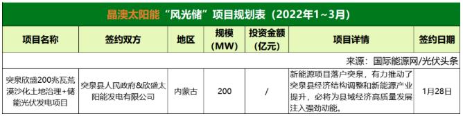 截至2022年3月31日,晶澳太陽(yáng)能共簽約(規(guī)劃)1個(gè)風(fēng)光儲(chǔ)項(xiàng)目,項(xiàng)目規(guī)模為200MW。